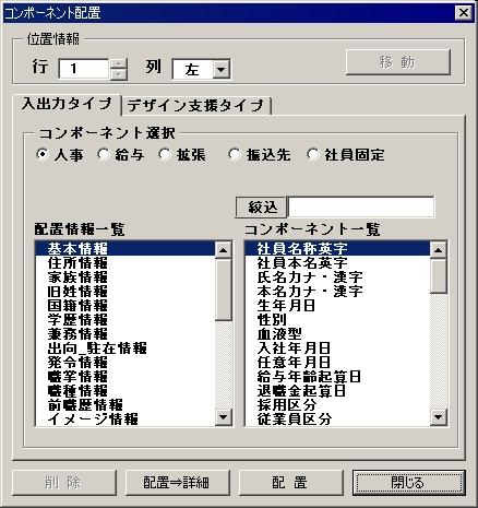 | コンポーネント選択 | テーブル分類 | テーブルの分類を人事/給与/拡張/振込先/社員固定から選択します。 | ラジオボタン | ||