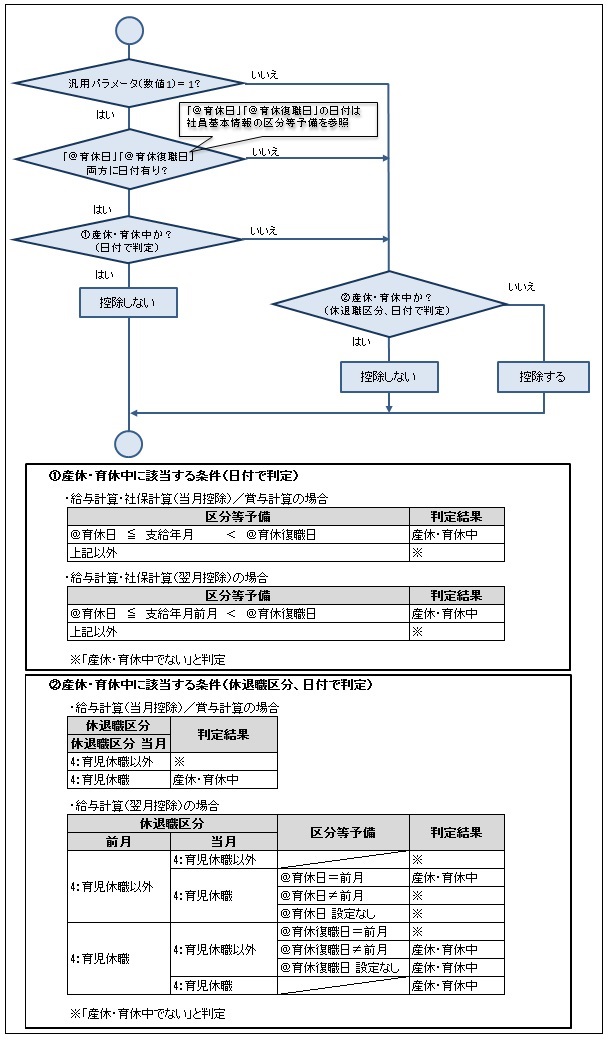 休退職区分で判定、翌月控除で前月と休退職区分が変わるときは@育休日、@育休復職日で判定します。 |