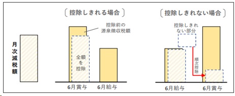 ・ 令和6年6月1日以後最初に支払われる給与等に対する源泉徴収税額から、減税額を控除します。控除しきれない部分の金額は、以後令和6年中に支払う給与等に対する源泉徴収税額から順次控除します。