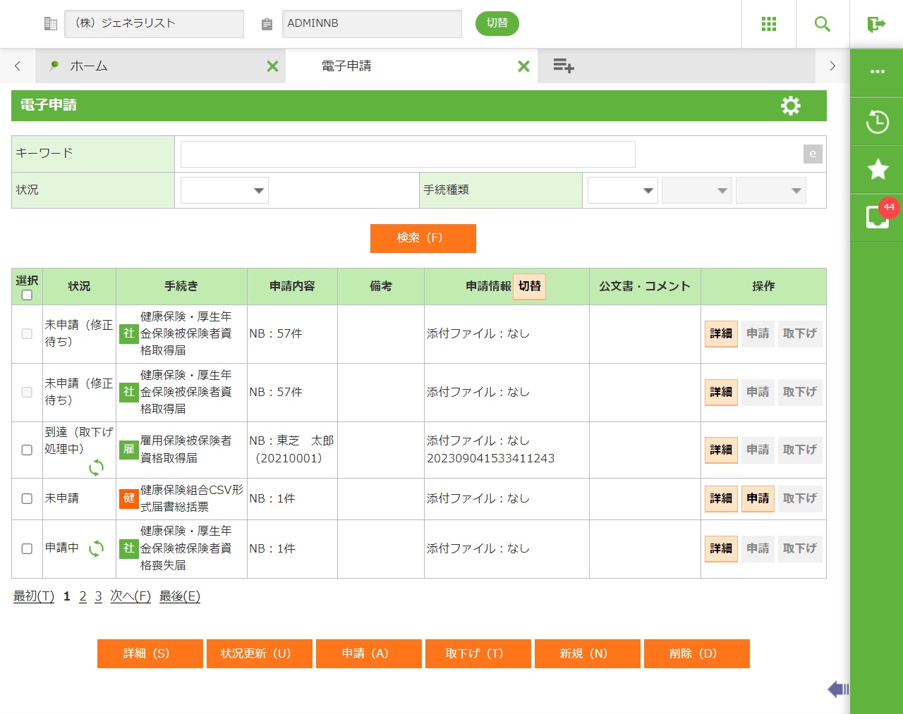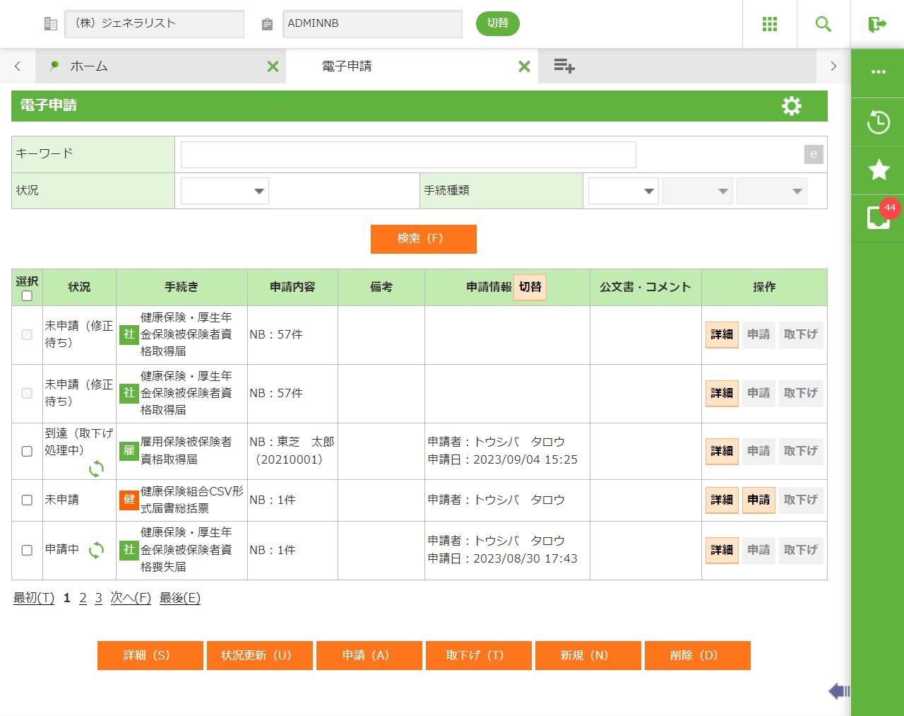電子申請更新サービス(17.2.3)を利用する場合、機能の再起動や「検索」ボタン押下等により画面をリフレッシュしたタイミングで、電子申請更新サービス(17.2.3)が更新した最新情報を表示します。