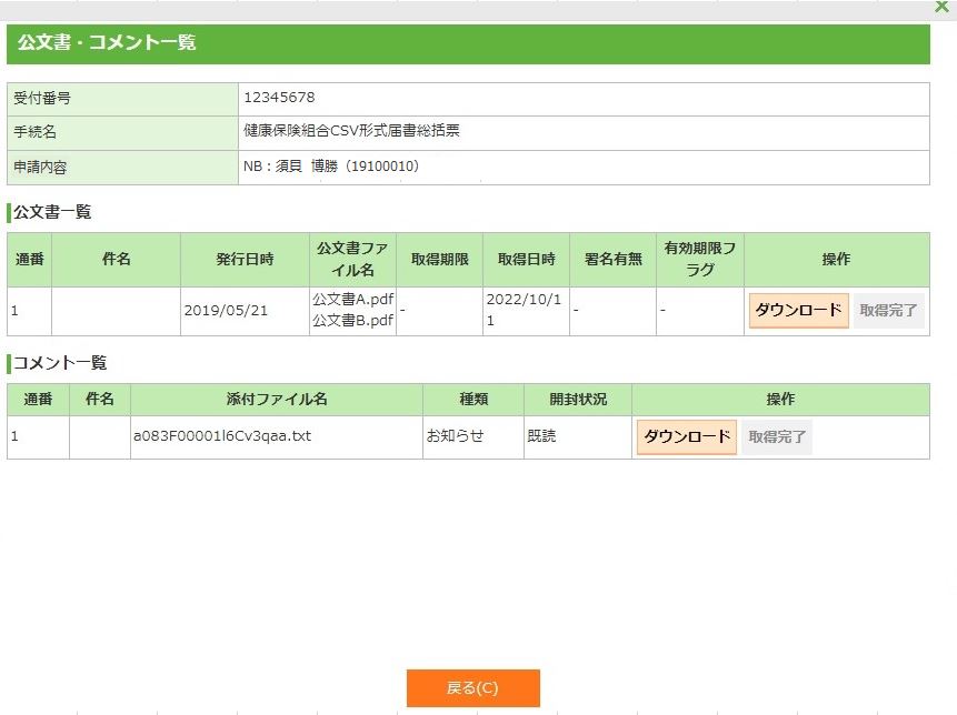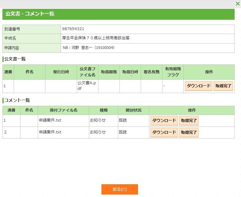 - 「取得完了」ボタンを表示する場合は、システム設定ファイル(egov-application.properties)で取得完了自動送信フラグ(0:自動送信しない、1:自動送信する)を「0」に変更してください。