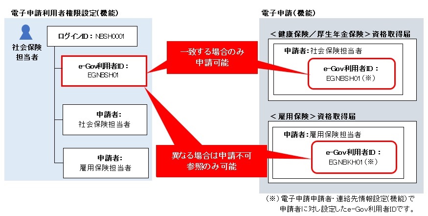 e-Gov利用者IDが異なる申請や、(1)または(2)のe-Gov利用者IDが未設定の場合は、電子申請利用者権限設定(17.4.4)で申請可能の権限を不可としたログインIDと同様、e-Gov、マイナポータルと通信を行う処理を行うことはできません。
