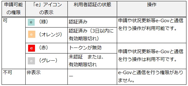 ・ 電子申請利用者権限設定(17.4.4)で設定した申請可能の権限(可/不可)による各操作の詳細は以下のとおりです。