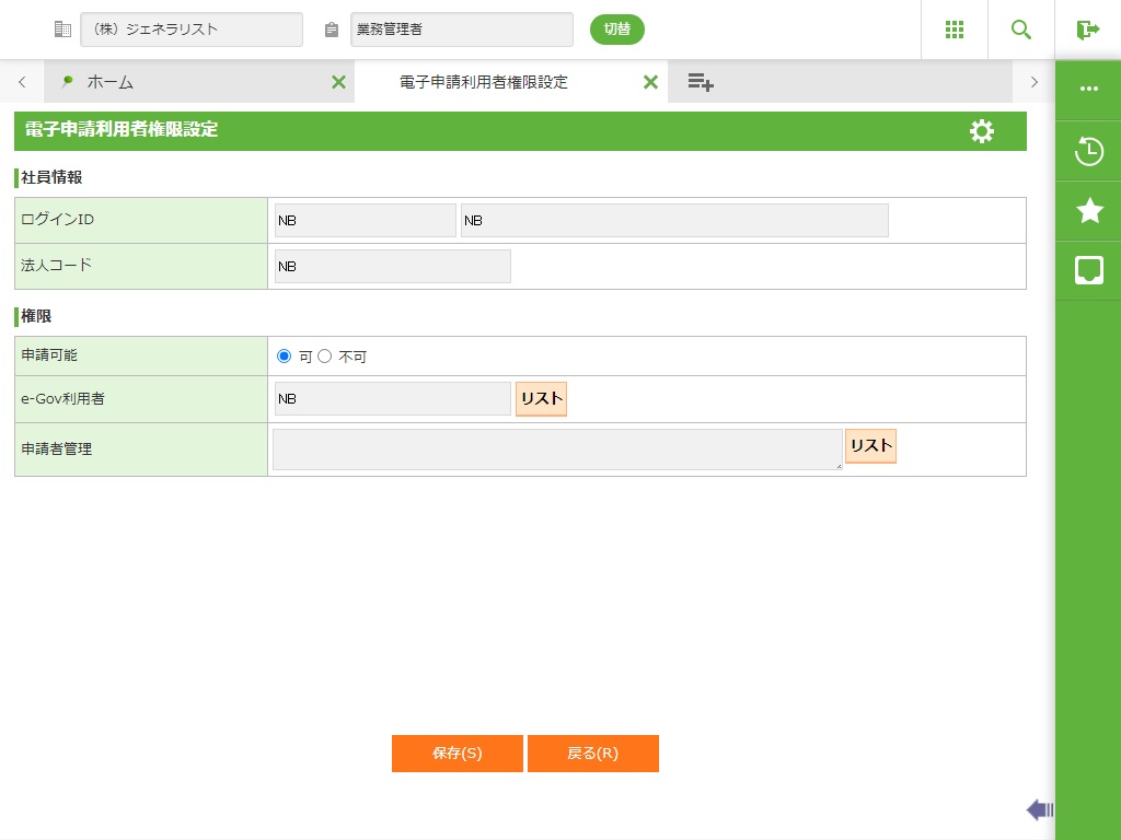 ・ 申請権限を不可とした場合、e-Govおよびマイナポータルとの通信を伴う操作はできませんが、申請の参照・作成・修正は可能です。