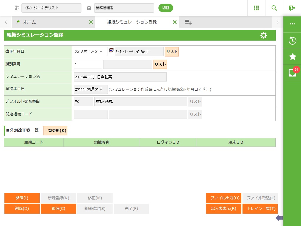 組織シミュレーションの登録、シミュレーション中の案件の確認を行います。