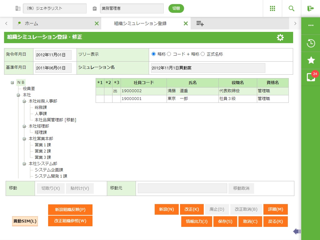 ・ 作成される異動シミュレーションの発令年月日は改正年月日と同じ日付となり、識別番号も「組織シミュレーション登録」画面より入力した値と同じになります。