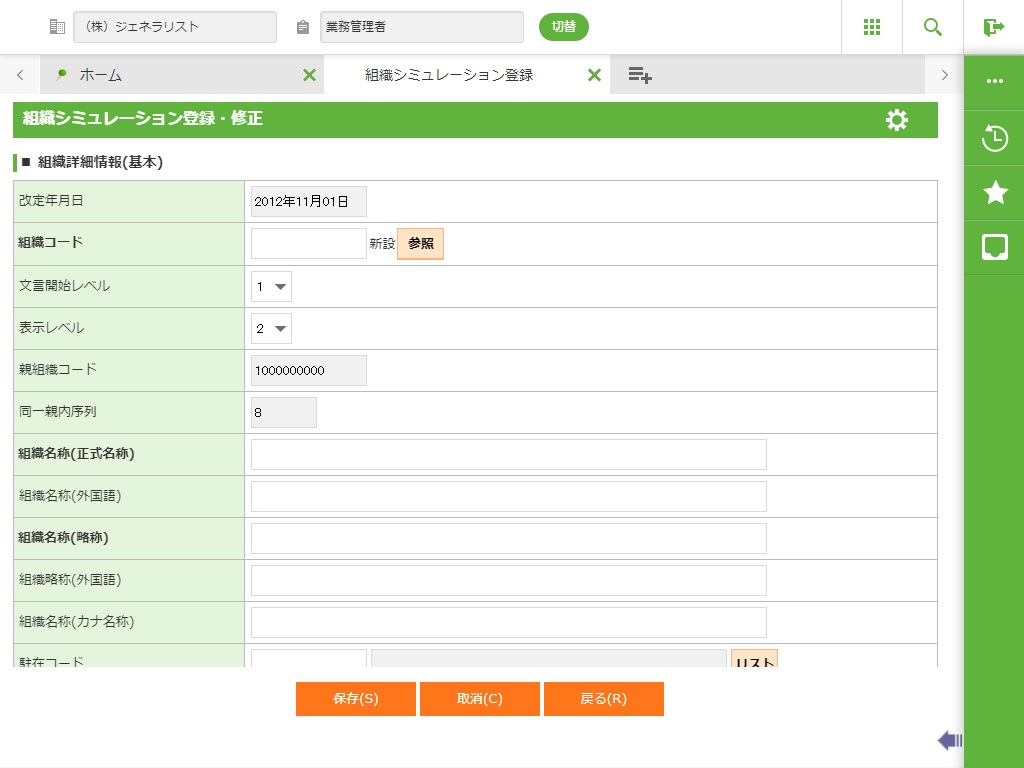 組織シミュレーションを開始した際に基準とした組織マスタの改正年月日を表示します。 新規登録時には表示されません。 |