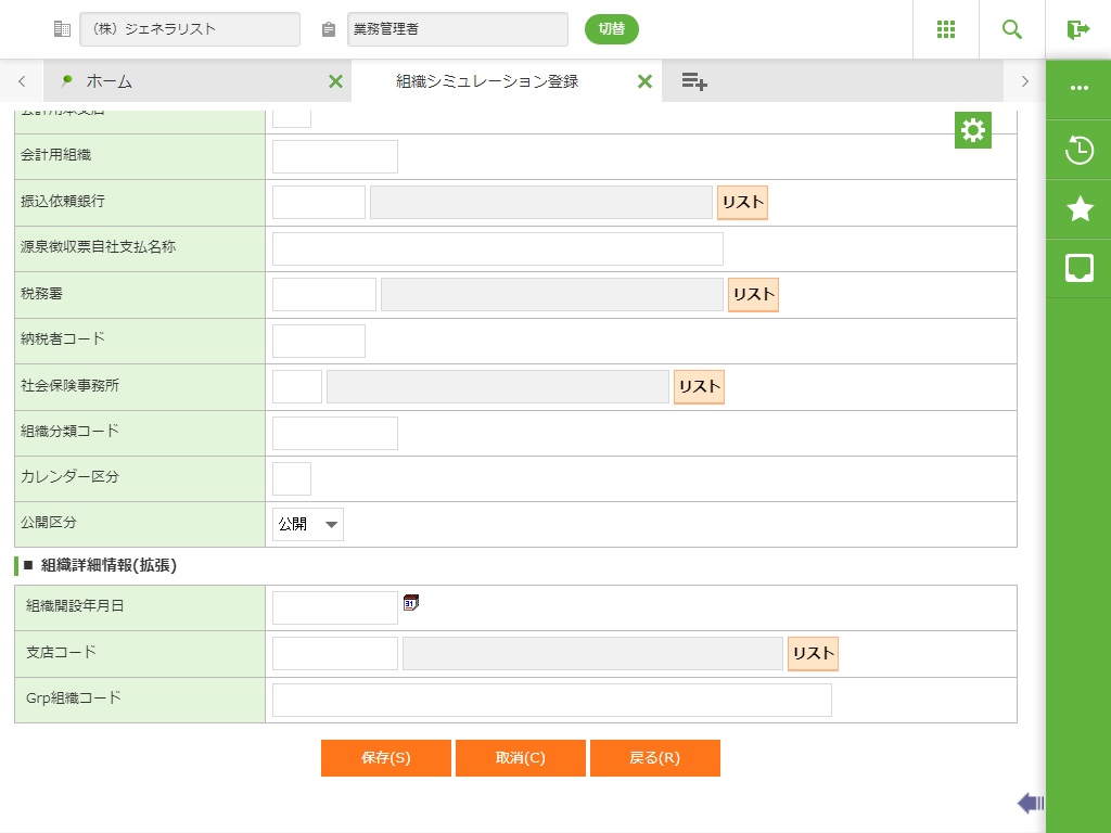 この画面を終了し、「組織シミュレーション登録」画面に戻ります。 |