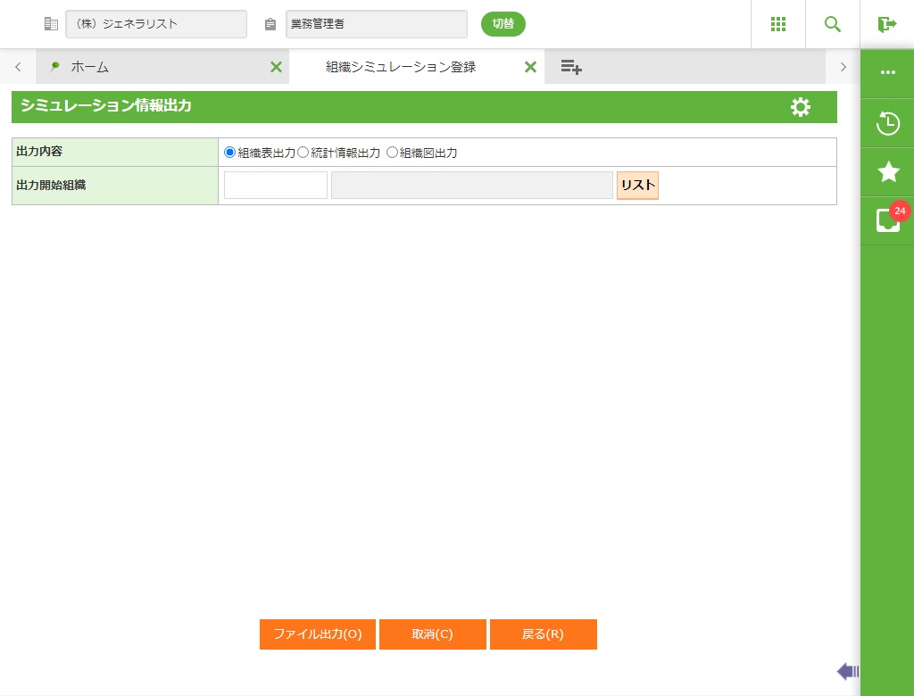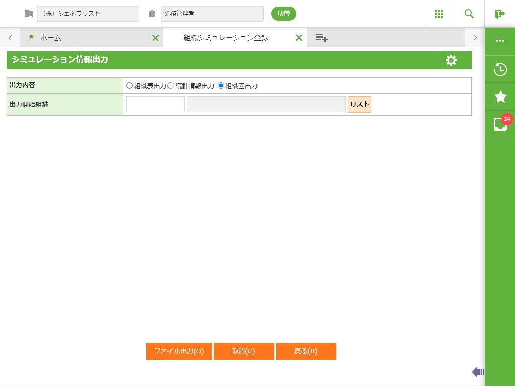 出力内容(組織図表示、組織表表示、統計情報出力)を選択します。組織シミュレーション案が無い場合には選択できません。 |