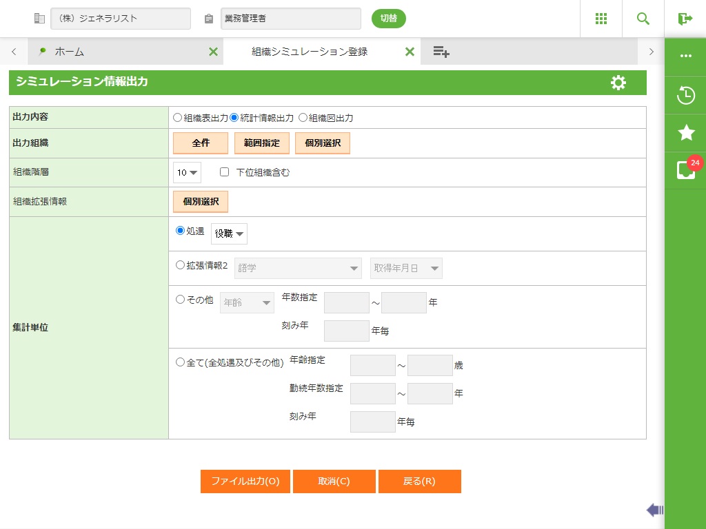 出力内容(組織表表示、統計情報出力)を選択します。 |