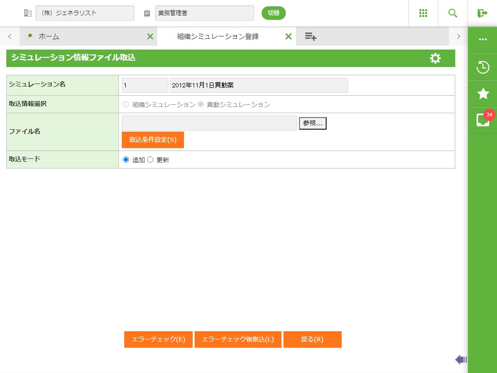 ・ 全権限またはトップ組織の組織参照権限を持っている場合のみ、組織シミュレーション情報の取込を行うことができます。