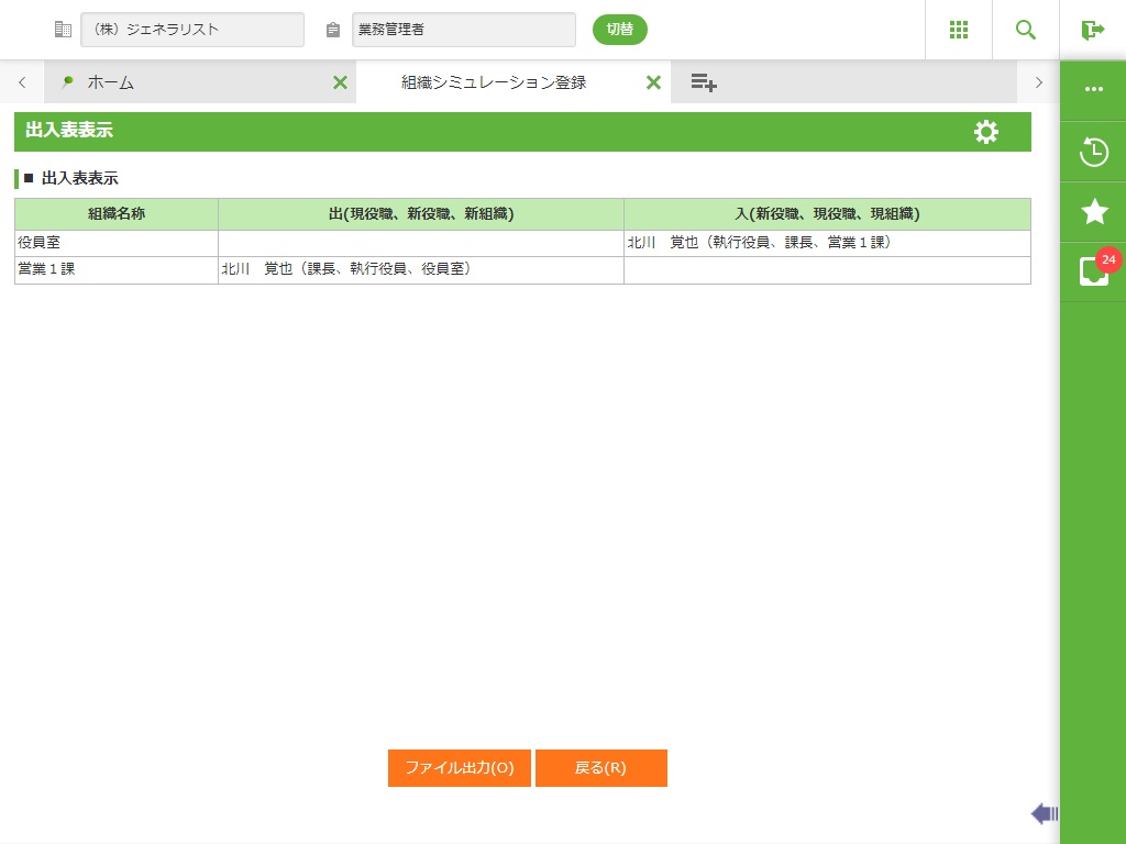 選択した組織シミュレーション案の出入表を表示します。 組織シミュレーション案の新規登録時に作成される異動シミュレーション案の結果のみが表示されます。 開始組織の指定に関わらず全組織が出力の対象となります。