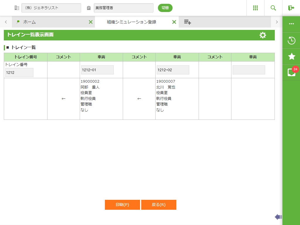 選択した組織シミュレーション案のトレイン一覧を表示します。 組織シミュレーション案の新規登録時に作成される異動シミュレーション案の結果のみが表示されます。