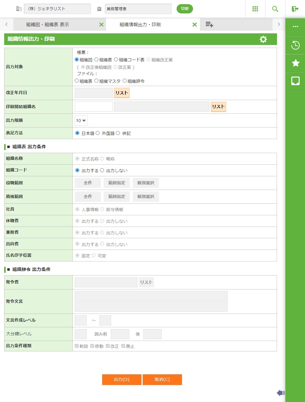 出力対象で「組織辞令」を選択すると、入力が可能です。 |