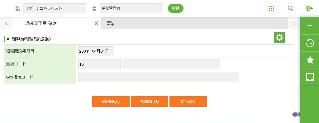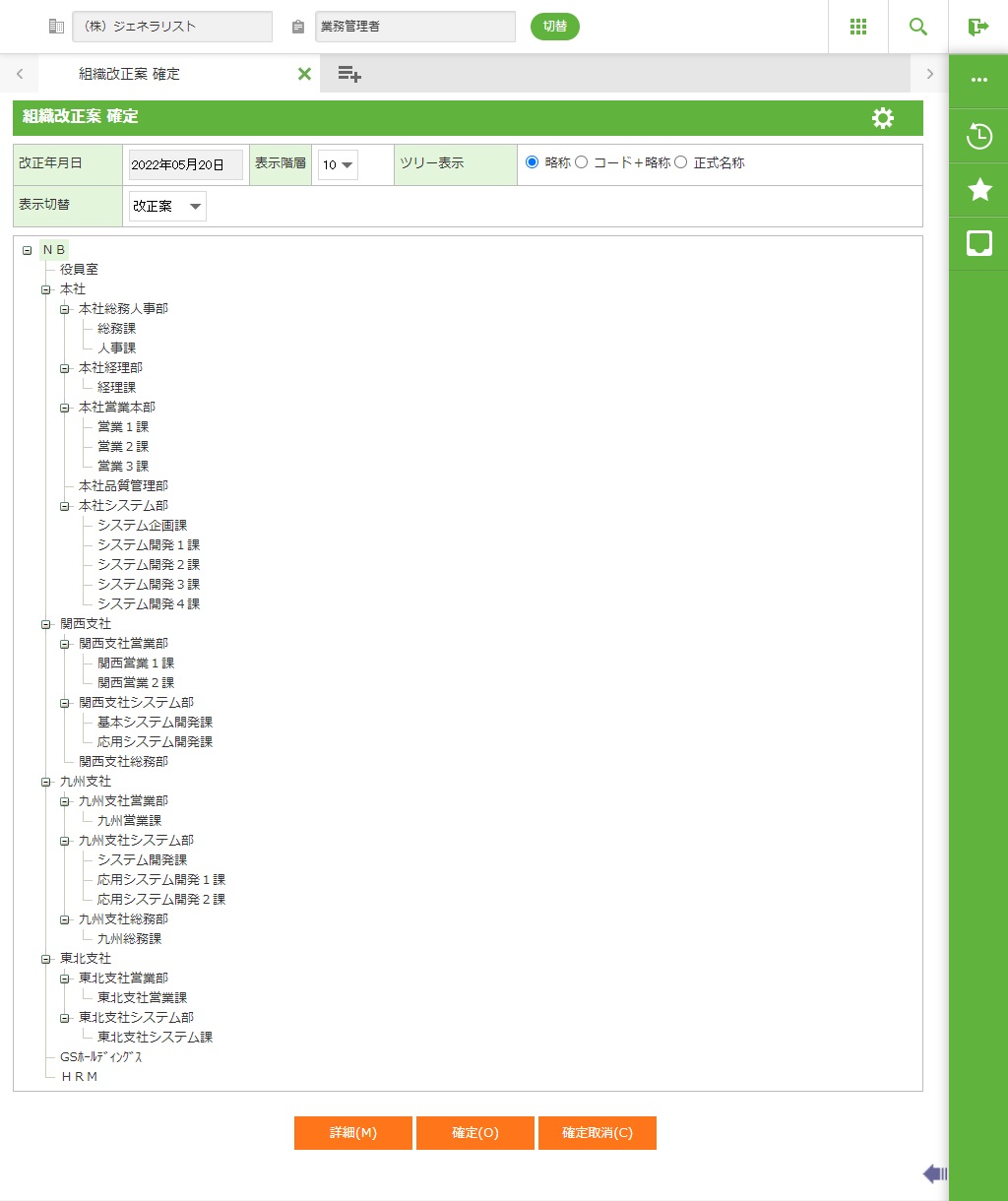 ・ 組織改正案確定画面で<詳細(M)>をクリックすると、この画面が表示されます。入力することは出来ません。