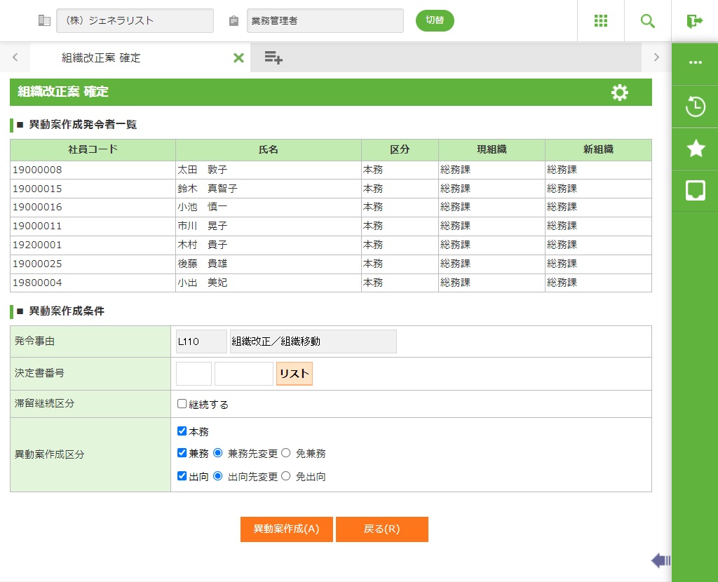 ・ 組織正式名称、序列に変更があった場合、組織改正が行われた組織及びその下位組織に所属する社員(兼務・出向者を含む)に対して一括で異動案を作成します。画面には、作成された案件の一覧が表示されます。作成された異動案は、通常の発令業務同様に承認・決裁処理が必要です。
