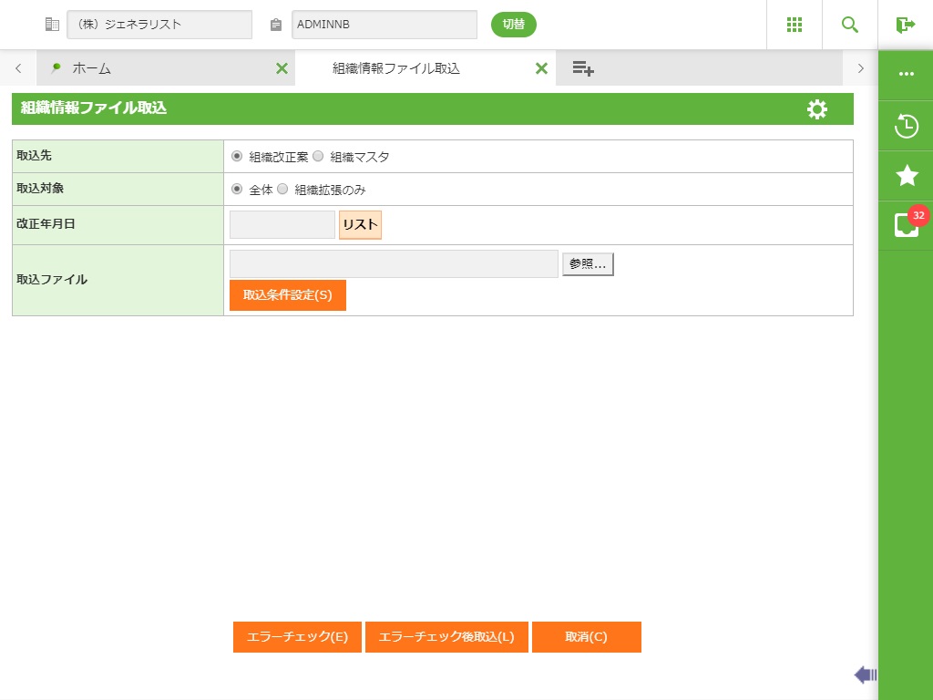 取り込むファイルの内容(組織改正案、または組織マスタ)を選択します。 | オプションボタン選択 |