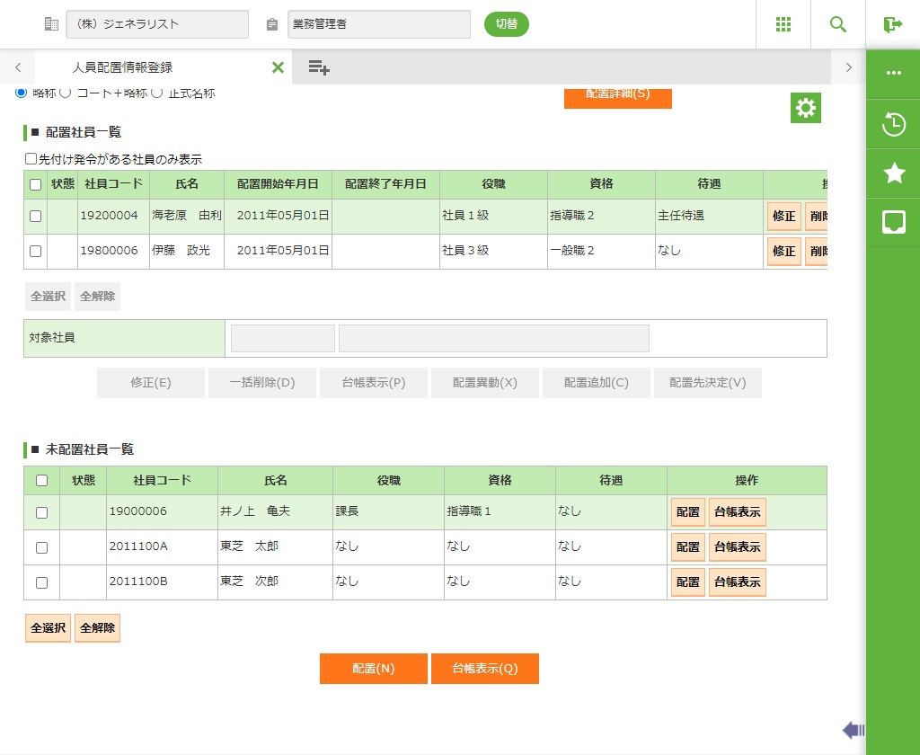 組織に紐づいている配置の表示/修正、社員の配置、人員配置情報登録/修正を行います。また、社員を選択後「台帳表示」ボタンを押下することにより、人事台帳を表示することが可能です。