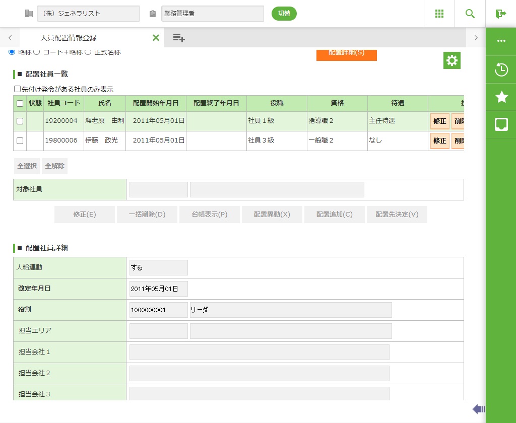 配置社員一覧で選択されている社員の人員配置情報を表示します。