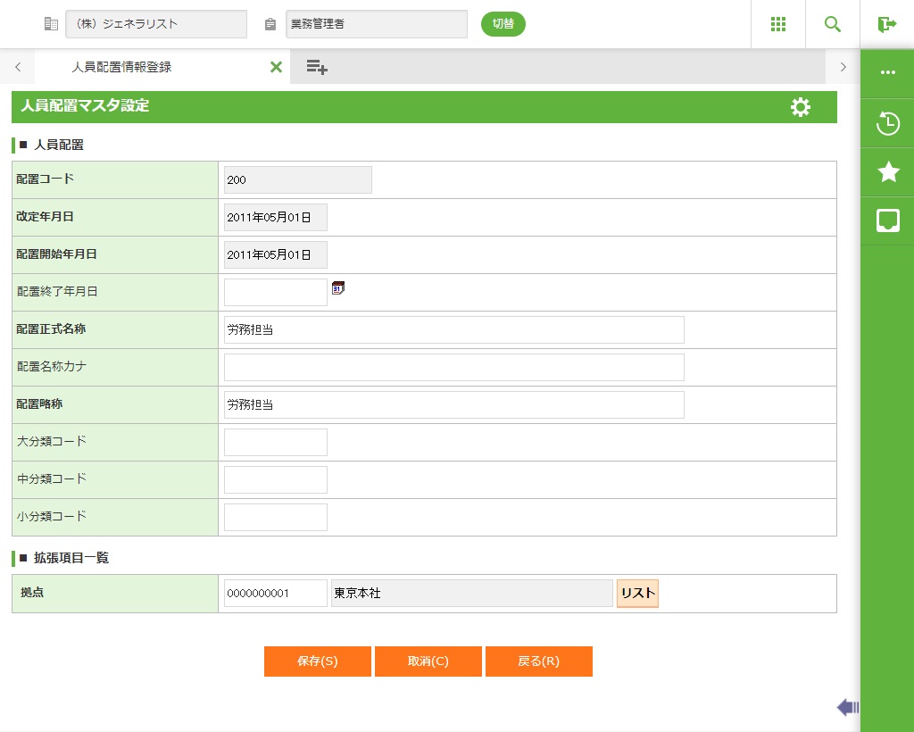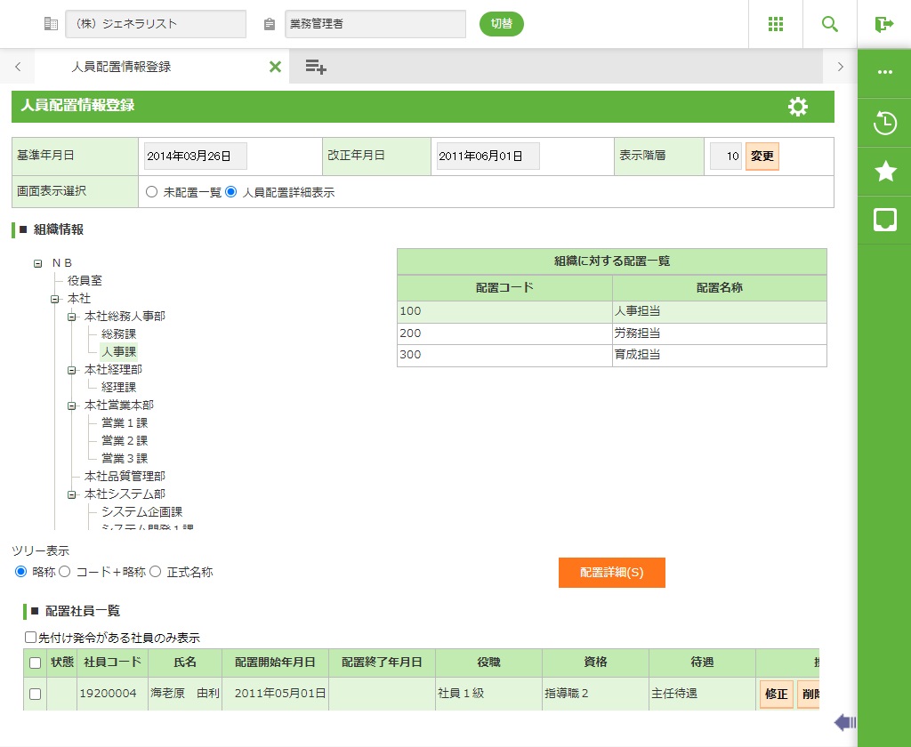 ・ 人員配置マスタに社員を配置、人員配置マスタの詳細内容を表示します。