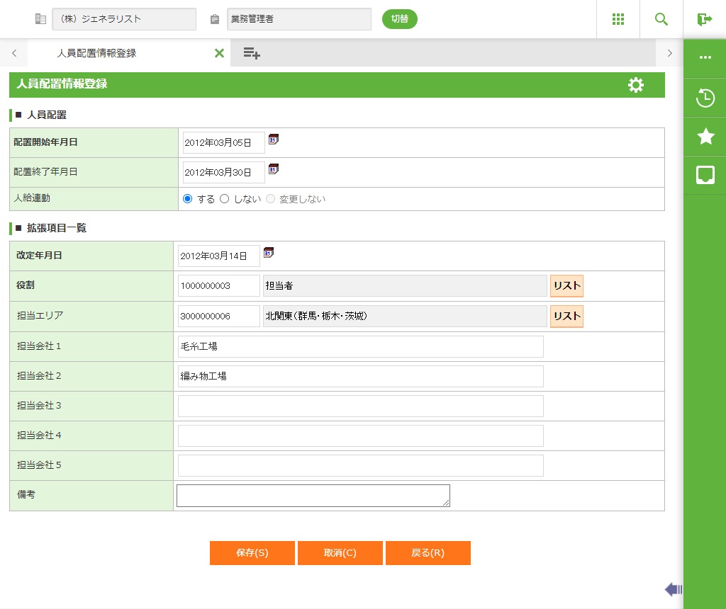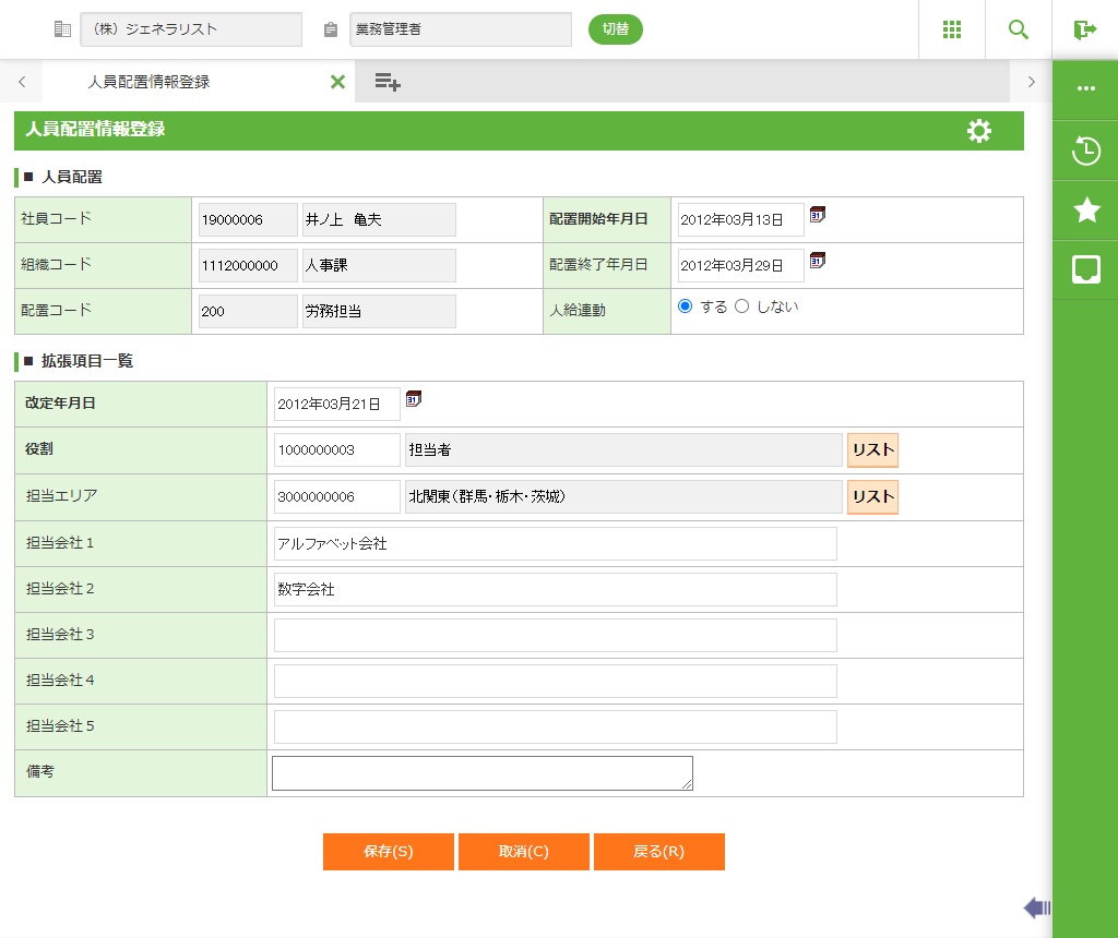 ・ 人員配置情報入力画面より起動する人事台帳についての人事台帳への起動権限のチェックは行っておりません。人員配置情報入力の処理をできる権限を持っている利用者は社員の情報を参照できる権限を持っているとGeneralistでは想定しています。