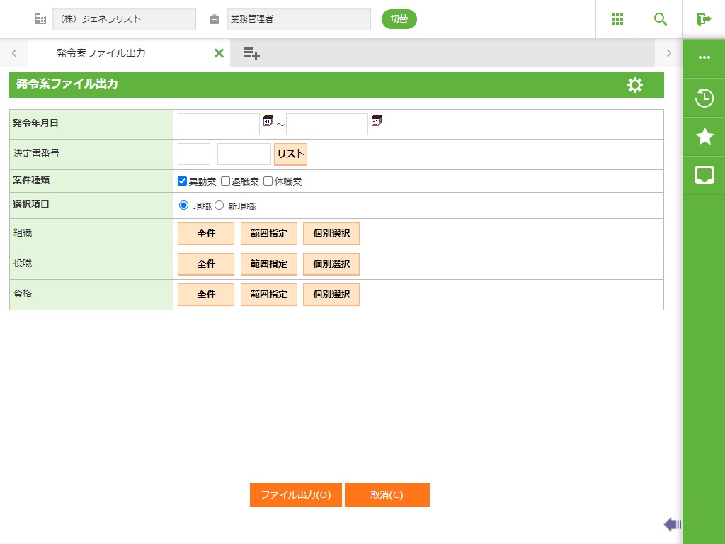 出力範囲を発令年月日で指定します。開始≦終了となるように入力してください。 |