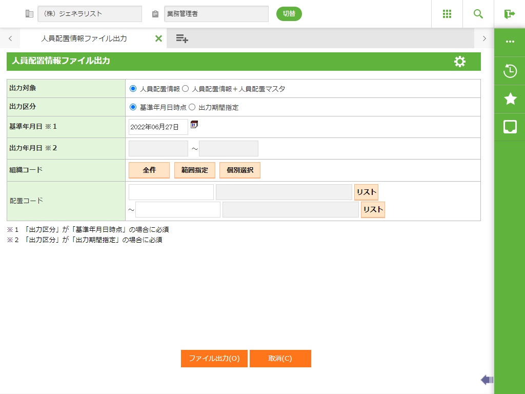 人員配置情報、もしくは人員配置情報+人員配置マスタの内容をCSV形式ファイルに出力します。