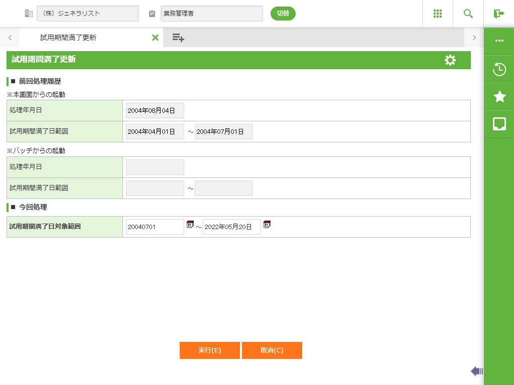 入力された範囲を対象に試用期間が満了になる社員の基本情報、組合歴情報を更新します。 |