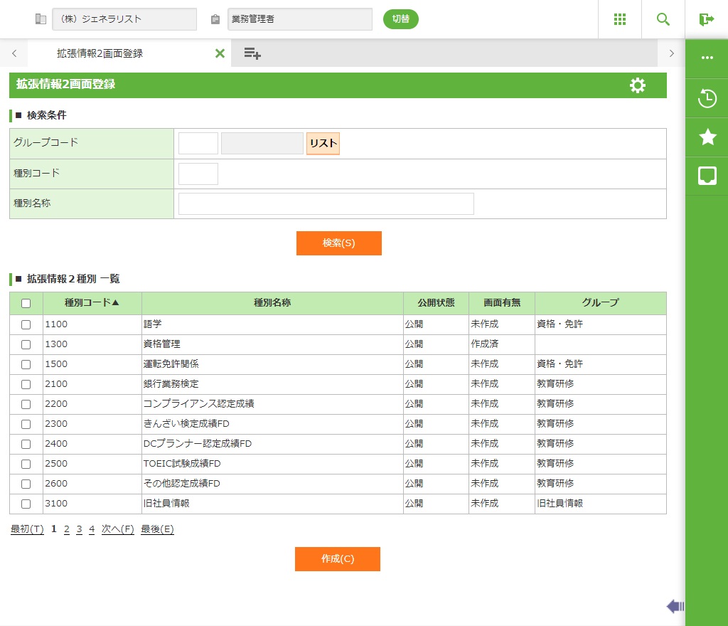 拡張情報2種別マスタに登録されている種別コード、種別名称、グループの公開状態の一覧が表示されます。 |