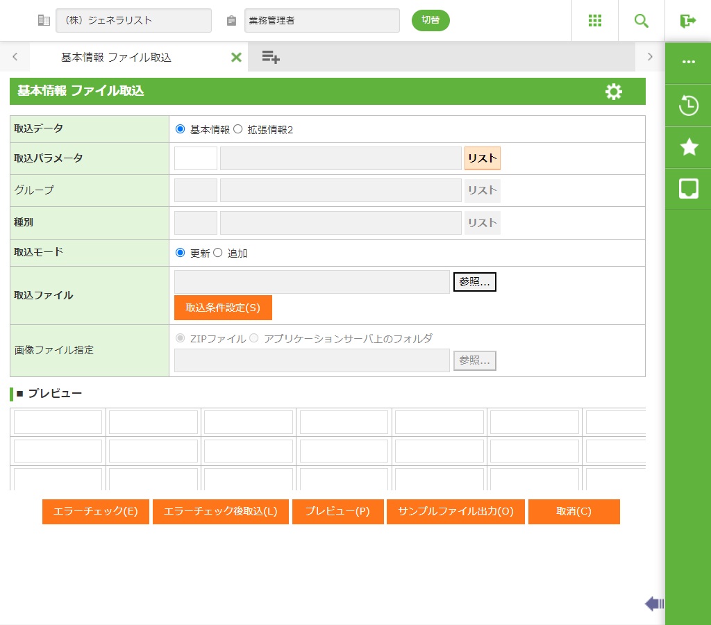 プレビューボタン押下時に、取込ファイルと取込パラメータが設定されており、かつ、ファイルが存在する場合にプレビューを表示します。 1行目・・・取込パラメータで登録した項目名 2行目以降・・・取込ファイルの先頭3行までのデータ行をプレビュー |