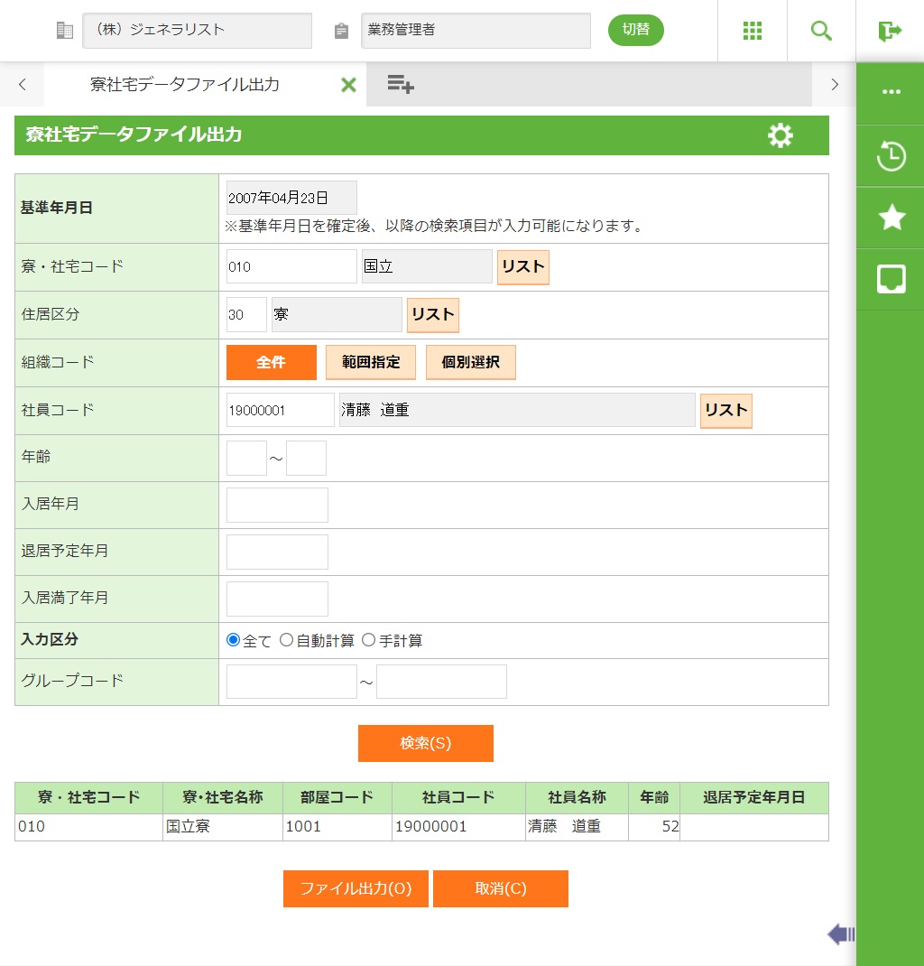 入力された検索条件で寮社宅の入居者データを検索します。 |
