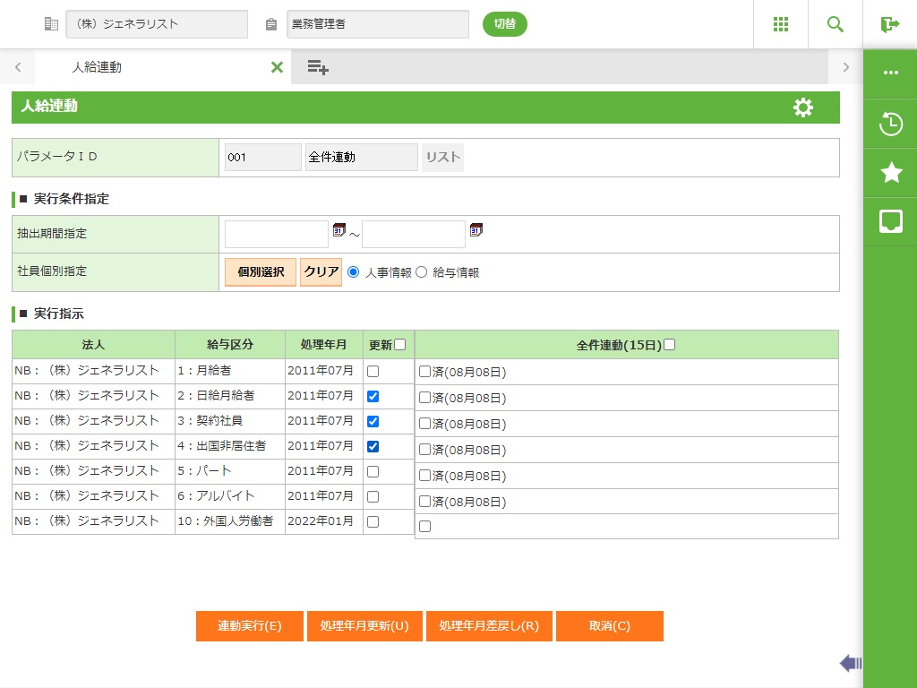 指定したパラメータIDで設定されている法人、給与区分、実行単位を一覧表で表示します。 実行単位のチェックボックスにチェックをいれた法人、給与区分、実行単位に対し、連動処理を実行します。実行単位で対象法人、給与区分の設定が無い場合には、チェックボックスは表示されません。 |
