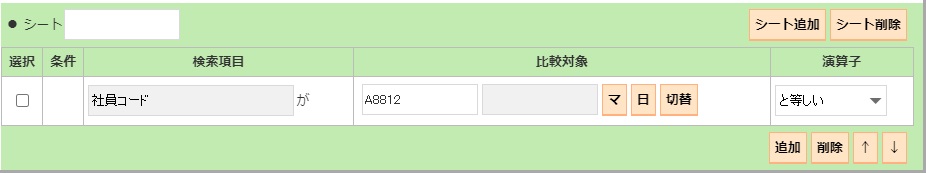 1.抽出条件に社員コードを指定し、その合計指定が「1」となっている