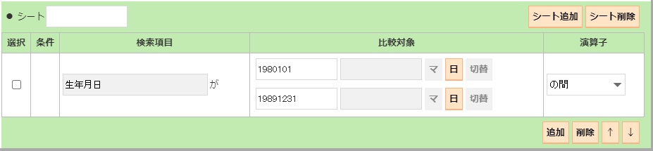 @条件保存モードを「個別」にして、検索条件設定画面にて条件出力を行った場合、「検索」になります。
