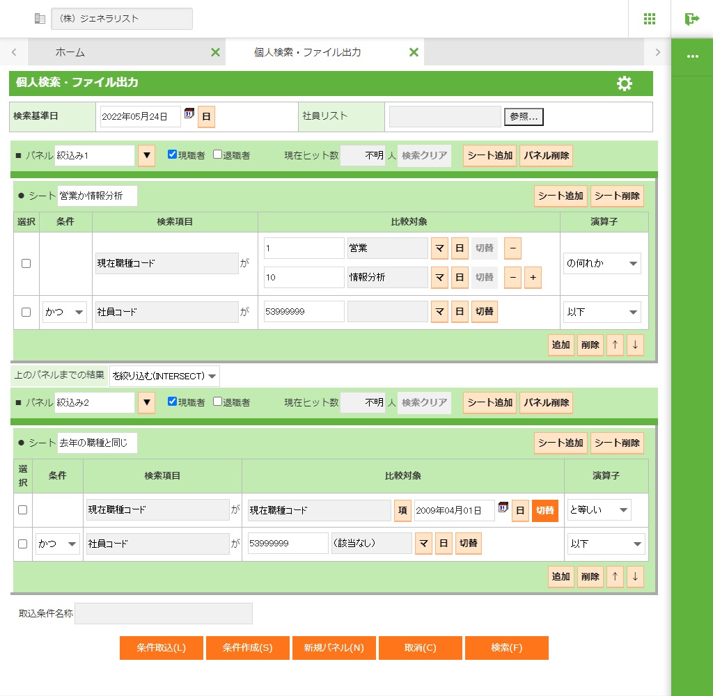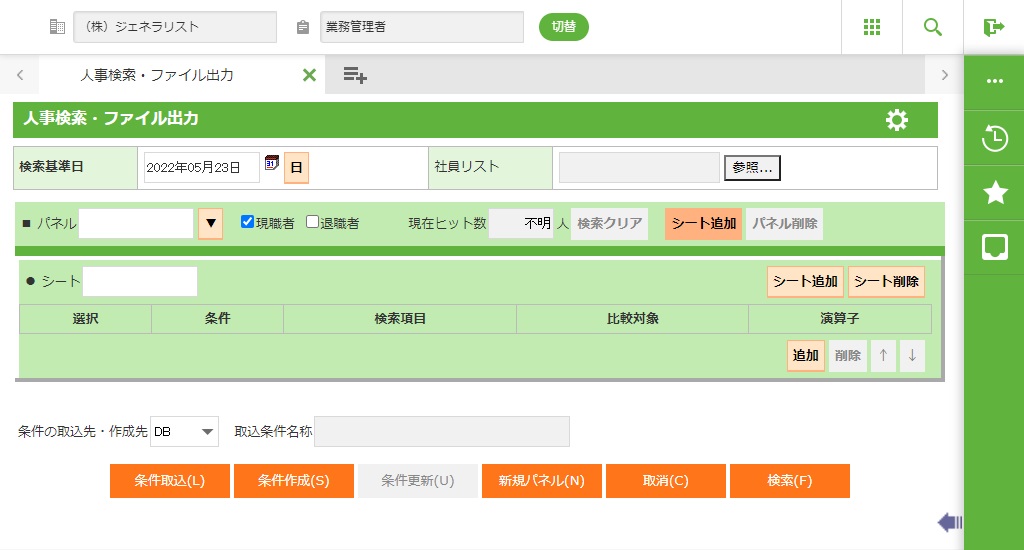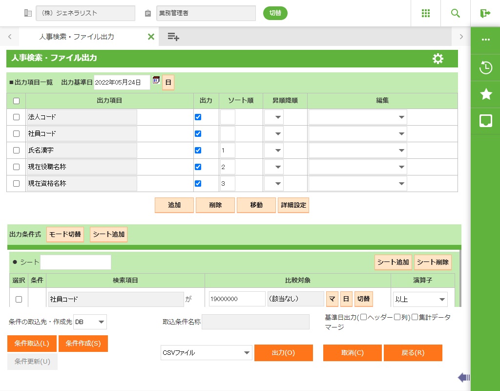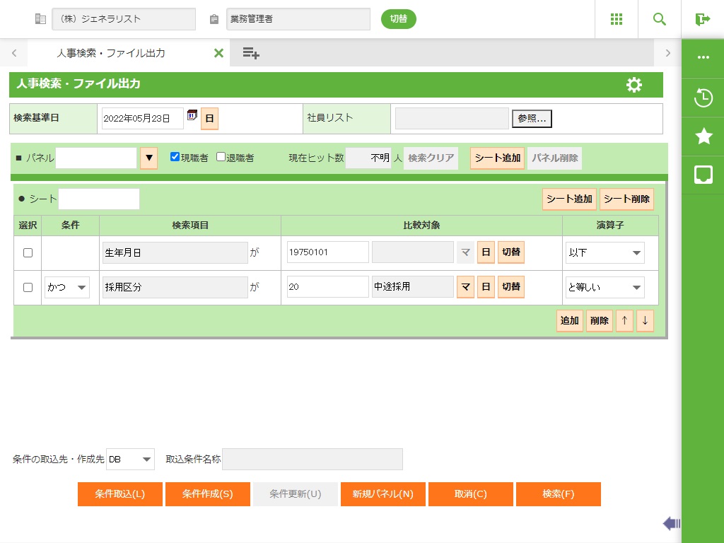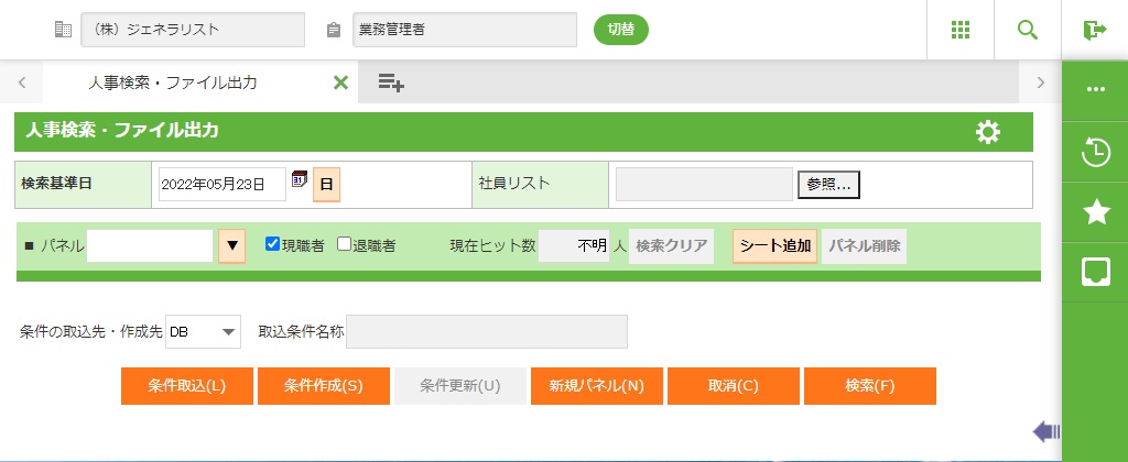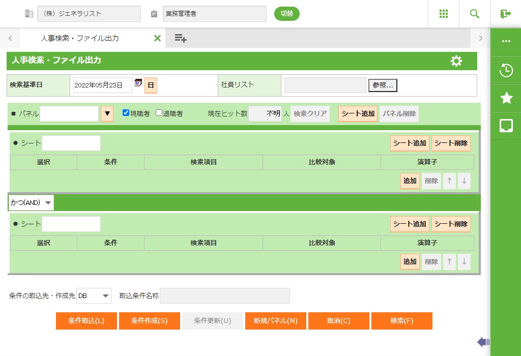 「人事検索・ファイル出力」は、検索基準日と項目一覧から指定した検索条件にしたがって社員情報を検索する機能です。