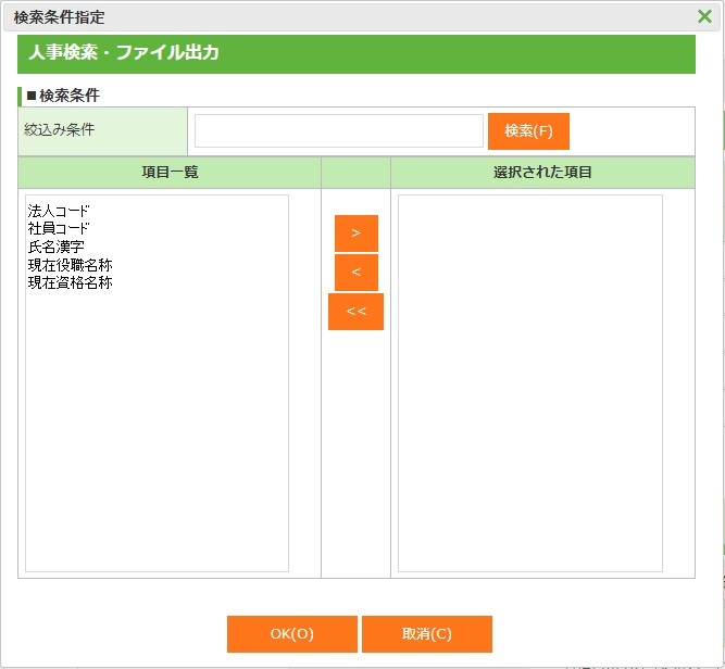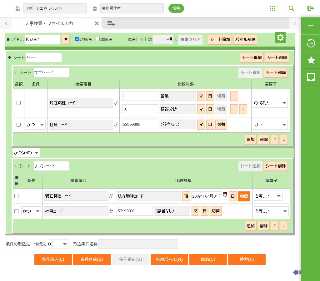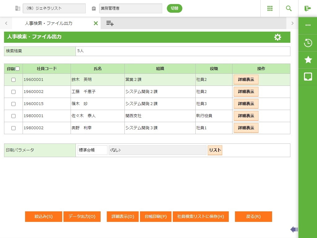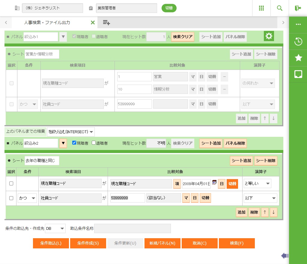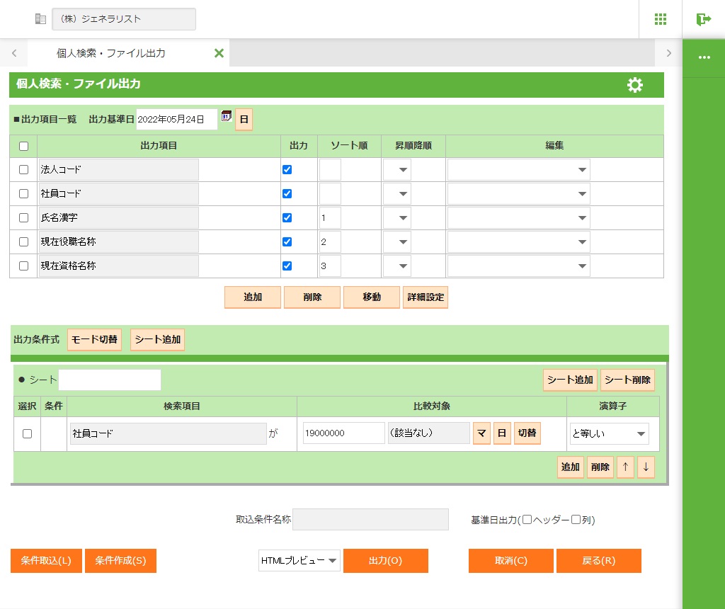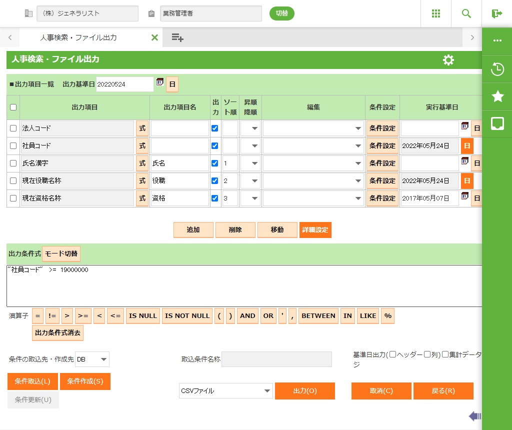 「人事検索・ファイル出力」は、検索基準日と項目一覧から指定した検索条件にしたがって社員情報を検索する機能です。