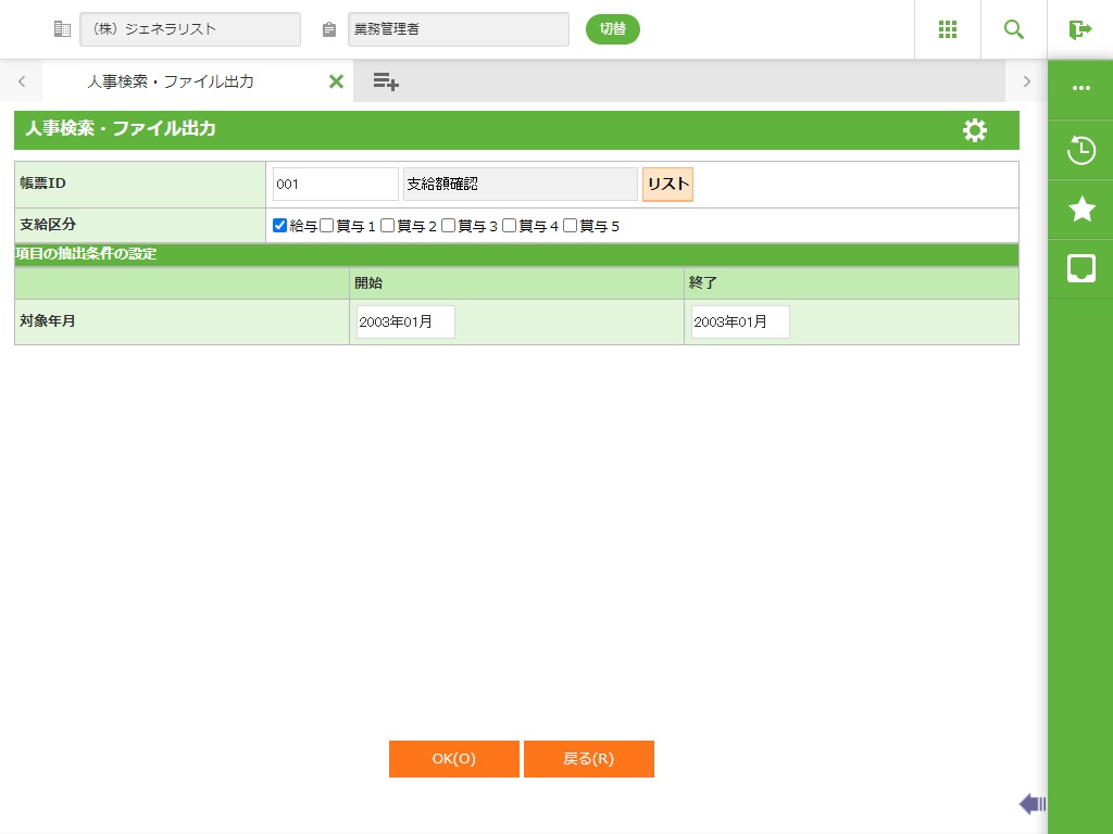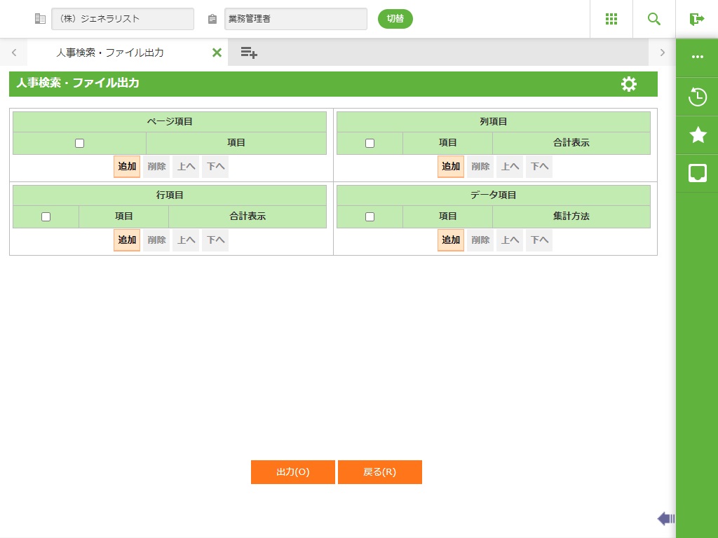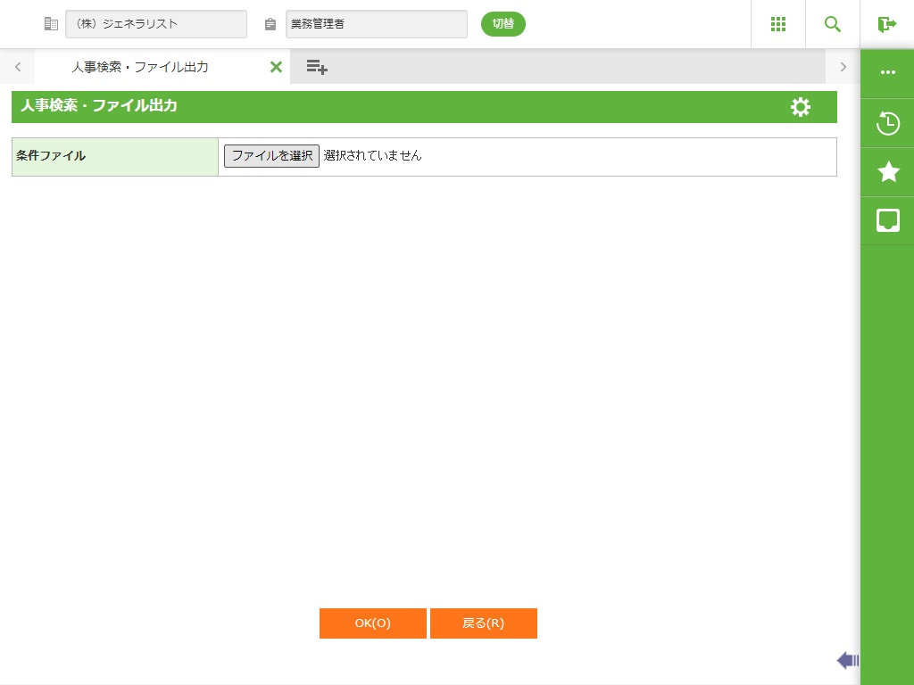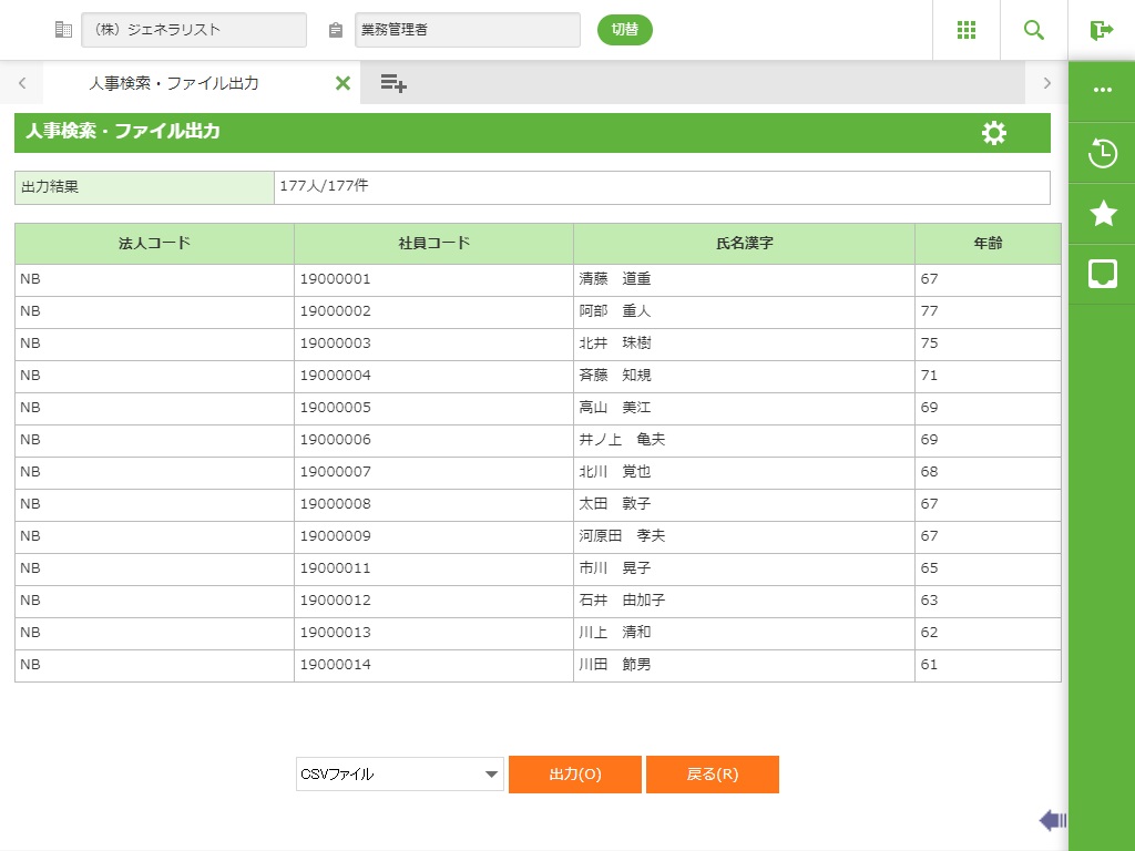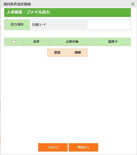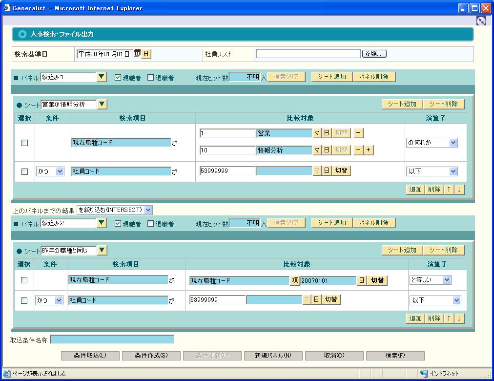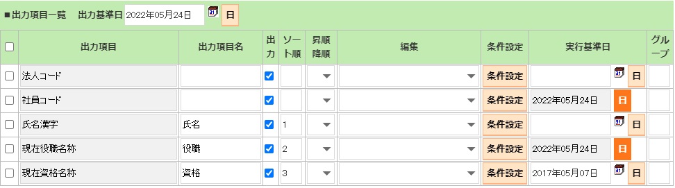 「人事検索・ファイル出力」は、検索基準日と項目一覧から指定した検索条件にしたがって社員情報を検索する機能です。