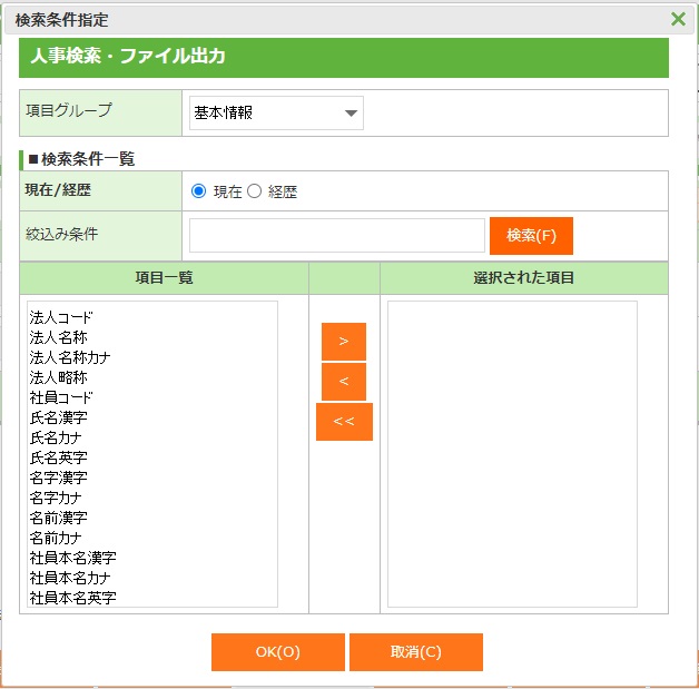 ・ 人事システムでは基本情報、および家族情報は履歴管理されていません。このため本機能の項目一覧における「基本情報」、「家族情報」でも現在の情報のみしか検索することができません。基本情報、および家族情報の過去の履歴情報を検索する場合には項目一覧から「人事情報履歴」、「家族情報履歴」を選択し、検索項目を指定してください。