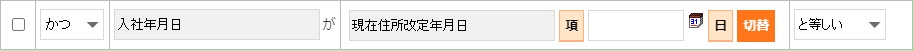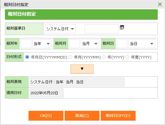 検索項目に対する年月日、年月、年のいずれかを「日」ボタンを押下することで表示される相対日付指定画面で年月日を指定した場合に基準日が表示されます。 |