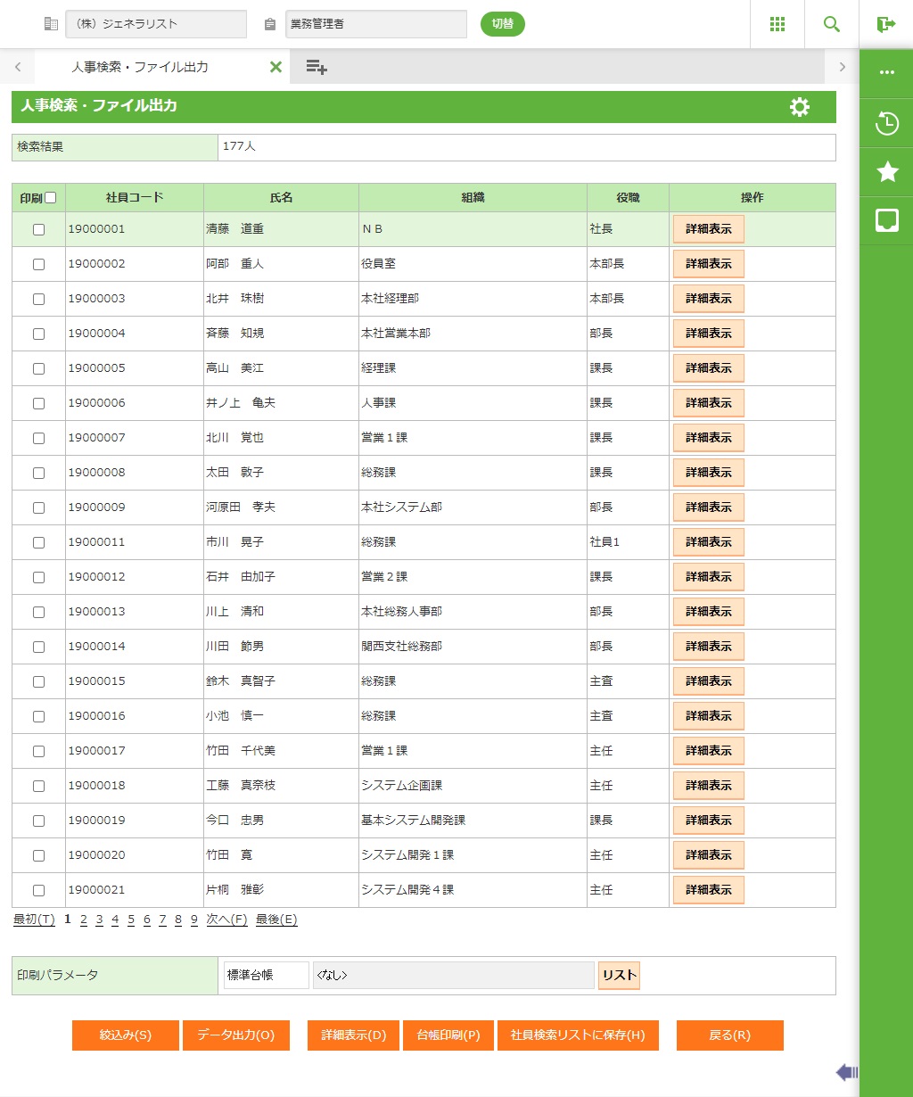 検索結果はCSVファイル、Excelファイル、画面内でプレビュー、またはデータベースに出力することができます。また検索結果の社員一覧表示から人事台帳の表示・印刷を行うことができます。