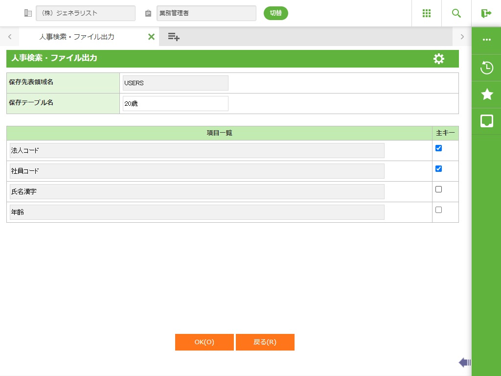 「人事検索管理マスタ」の「DB出力表領域」を表示します。 |