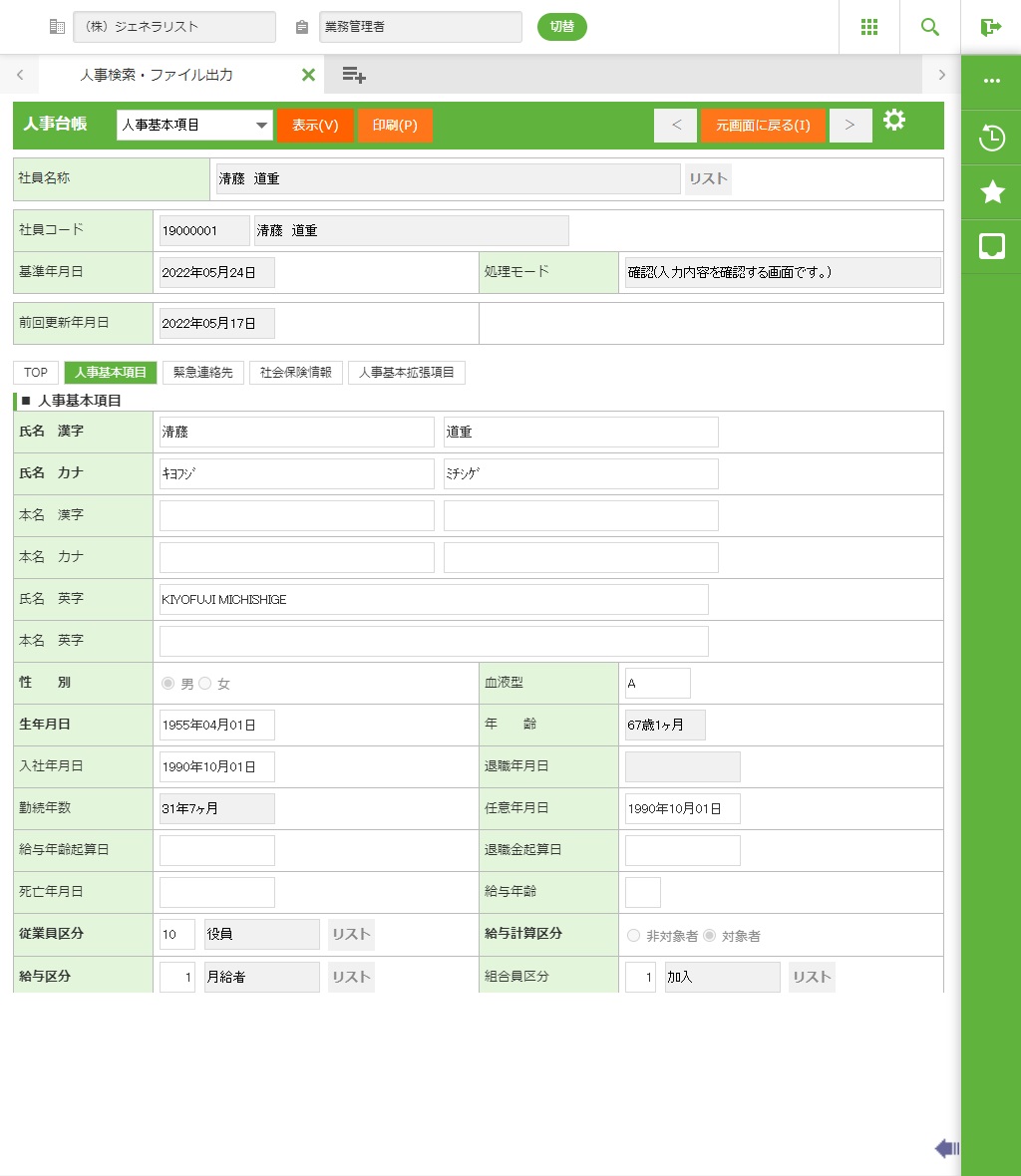 ・ 検索結果表示(2.6.2.6)にて確認した社員の詳細情報を人事台帳にて確認できます。