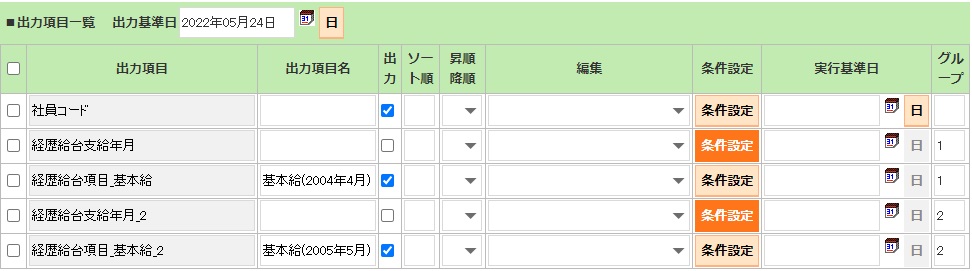 A条件保存モードを「個別」にして、出力条件設定画面にて条件出力を行った場合、「出力」になります。