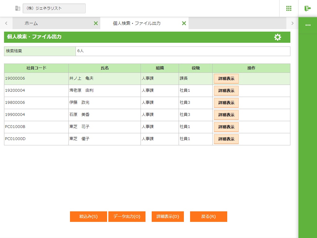 「人事検索管理マスタ」の「HTML表示行数」に設定した行数分のデータをプレビュー出力します。 各列の表示データ長が「人事検索管理マスタ」の「HTML表示バイト数」を超えている場合は、超えている分を「・・・」と省略して表示します。 |