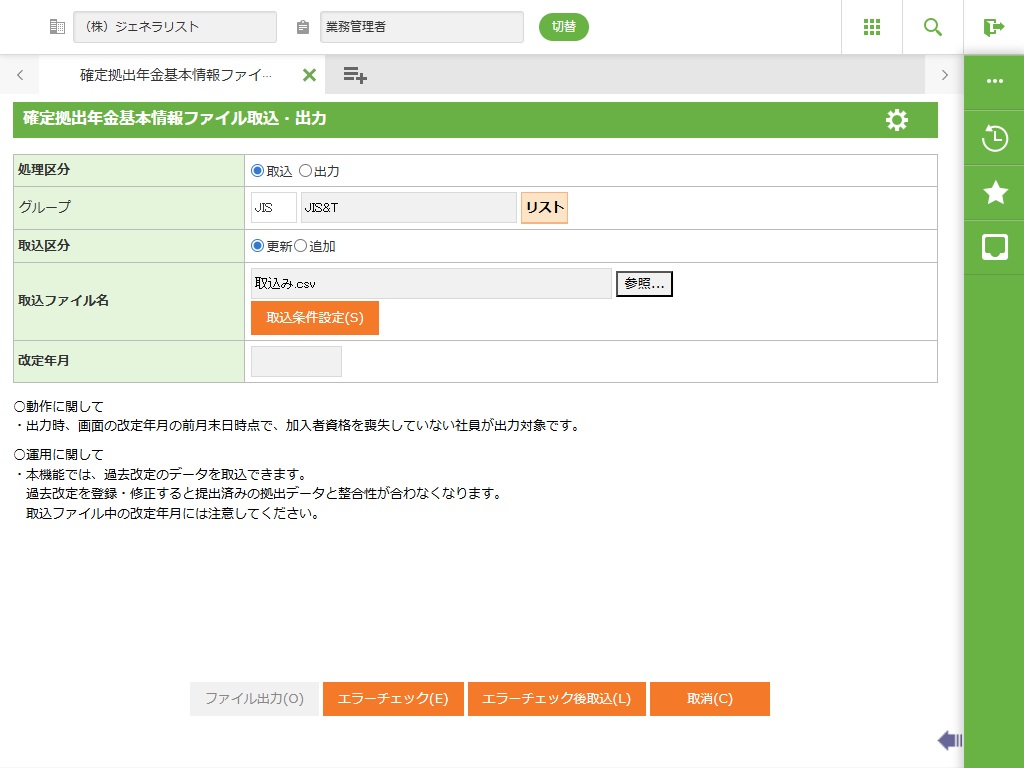 確定拠出年金基本情報をCSVファイルから一括で登録、及び更新します。