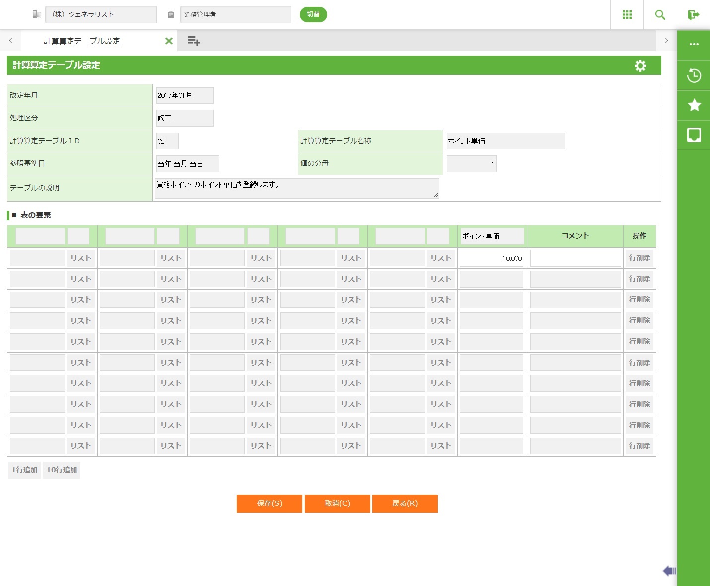 ・ 計算算定テーブルパラメータで要素の指定を行っていない場合(ポイント単価、再評価率など全対象者に一律の値を設定する場合)は1行目のみ入力可能です。