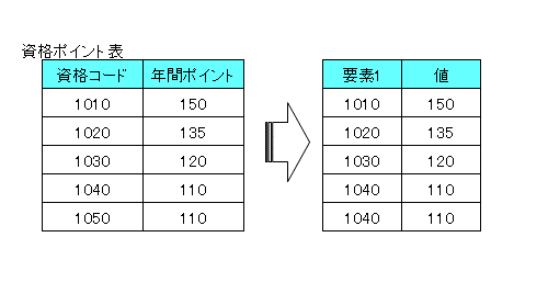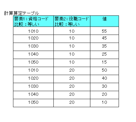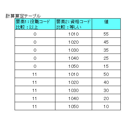 上記の計算算定テーブルから値を取得する場合、まず資格コードから要素1の値を特定し、その中から役職コードが要素2に当てはまる行を特定します。