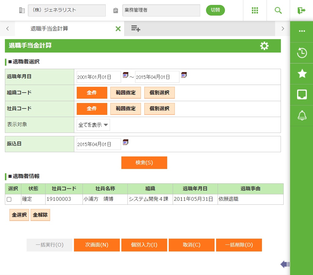 指定した期間内に退職扱いの発令がある社員を検索し一括計算したり、