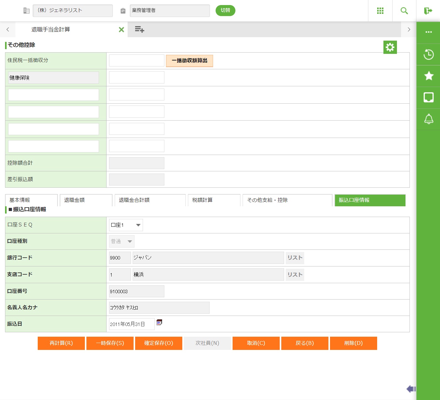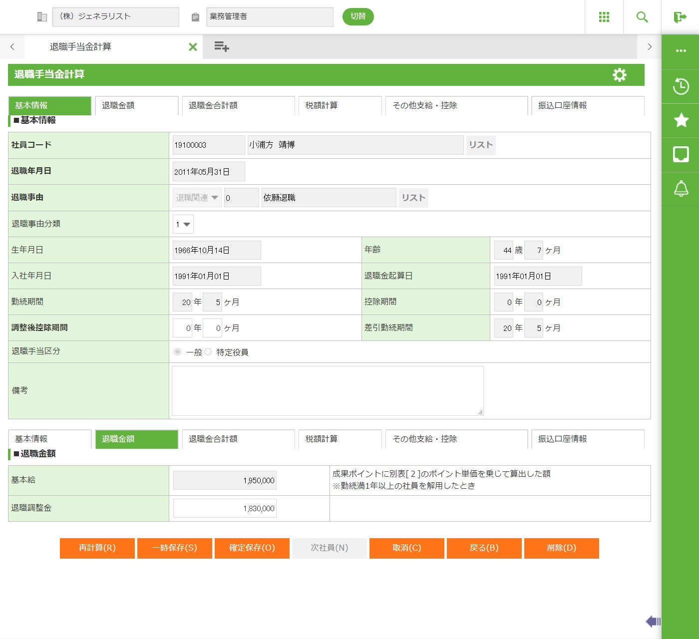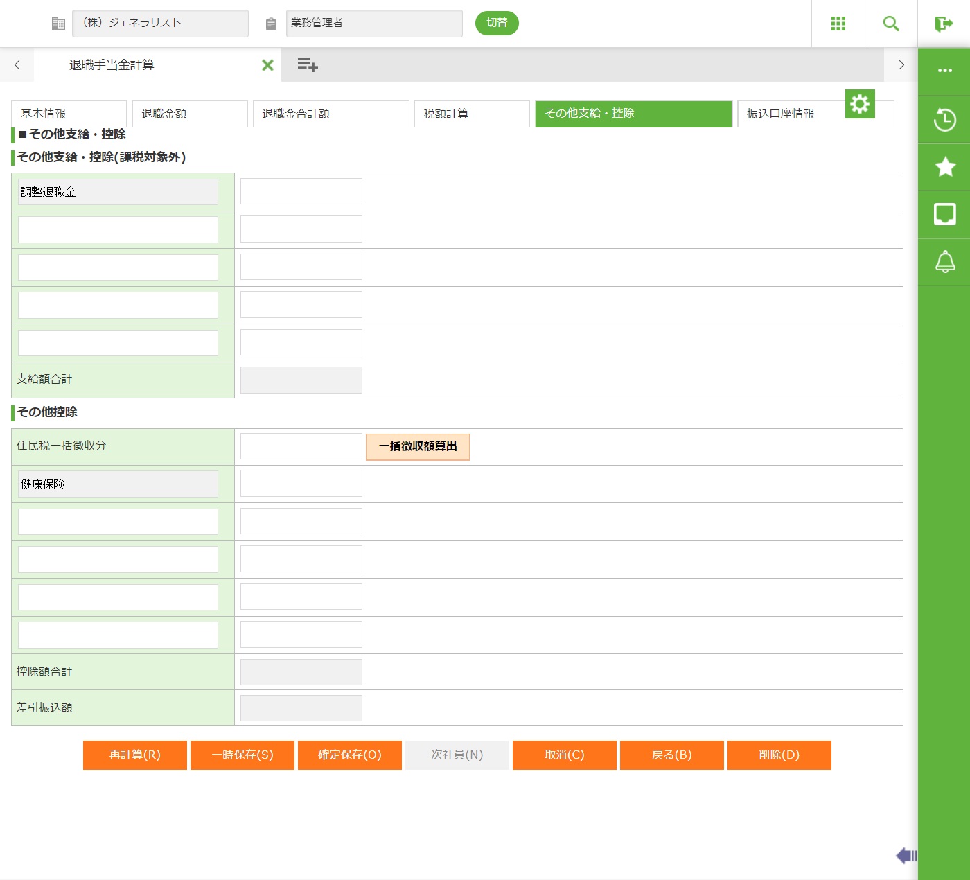 手入力された金額等を加味し、再計算を実行します。再計算対象の項目は、差引勤続期間・退職金額・退職金合計額・所得控除額・所得税額・市区町村民税・都道府県民税・控除額合計・差引支給額です。 |