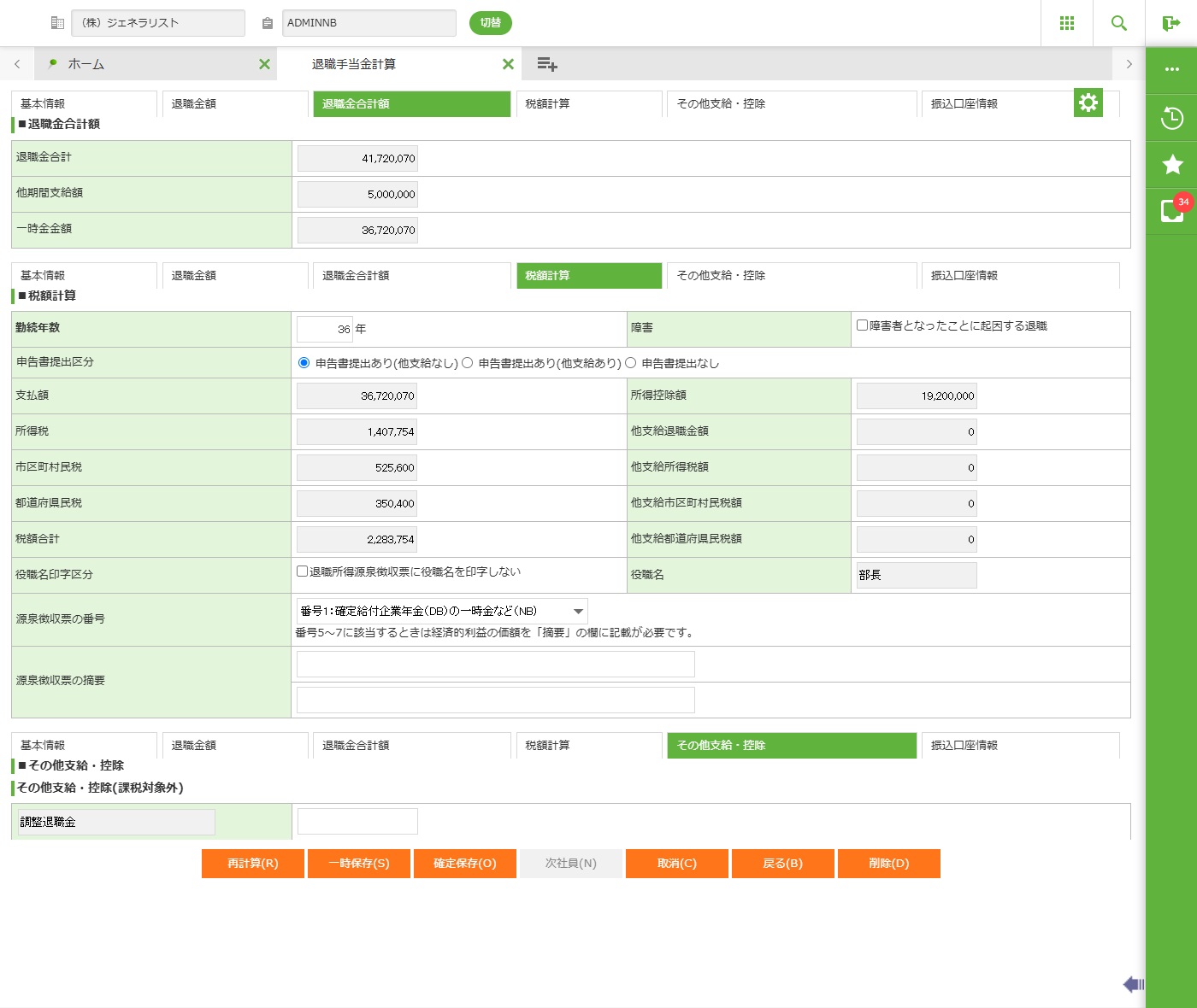 ・一時保存した後、「■税額計算」の勤続年数が変更になる場合は、一旦削除して登録し直すか、または勤続年数を修正し再計算を行ってください。